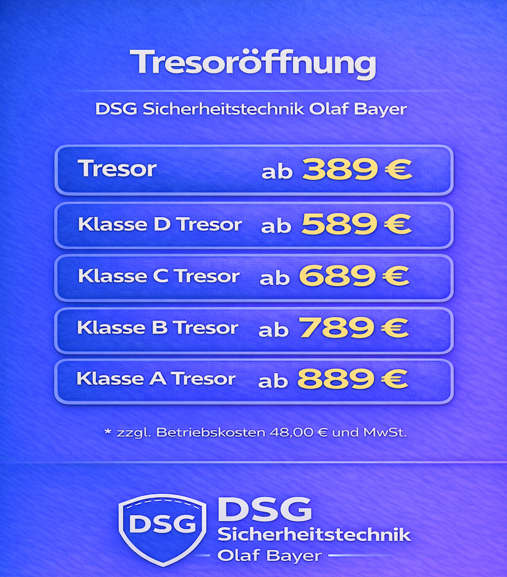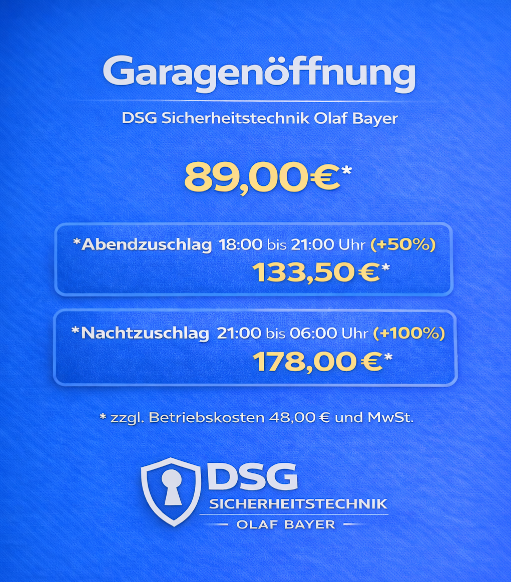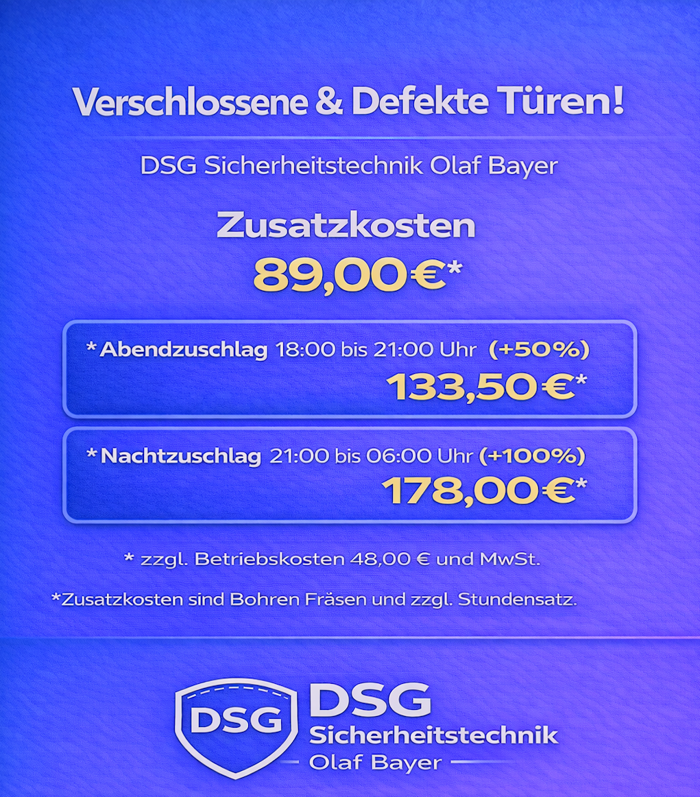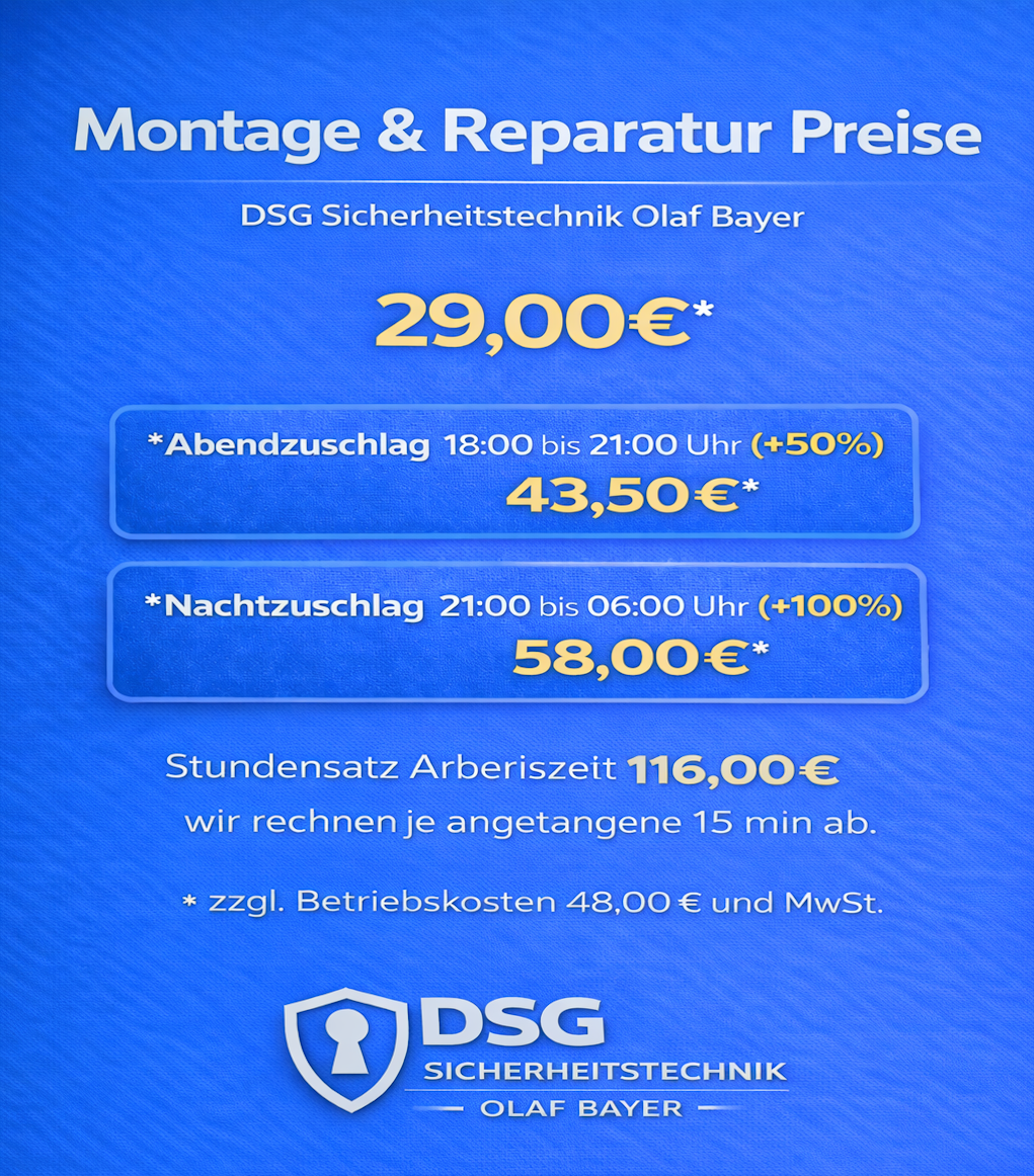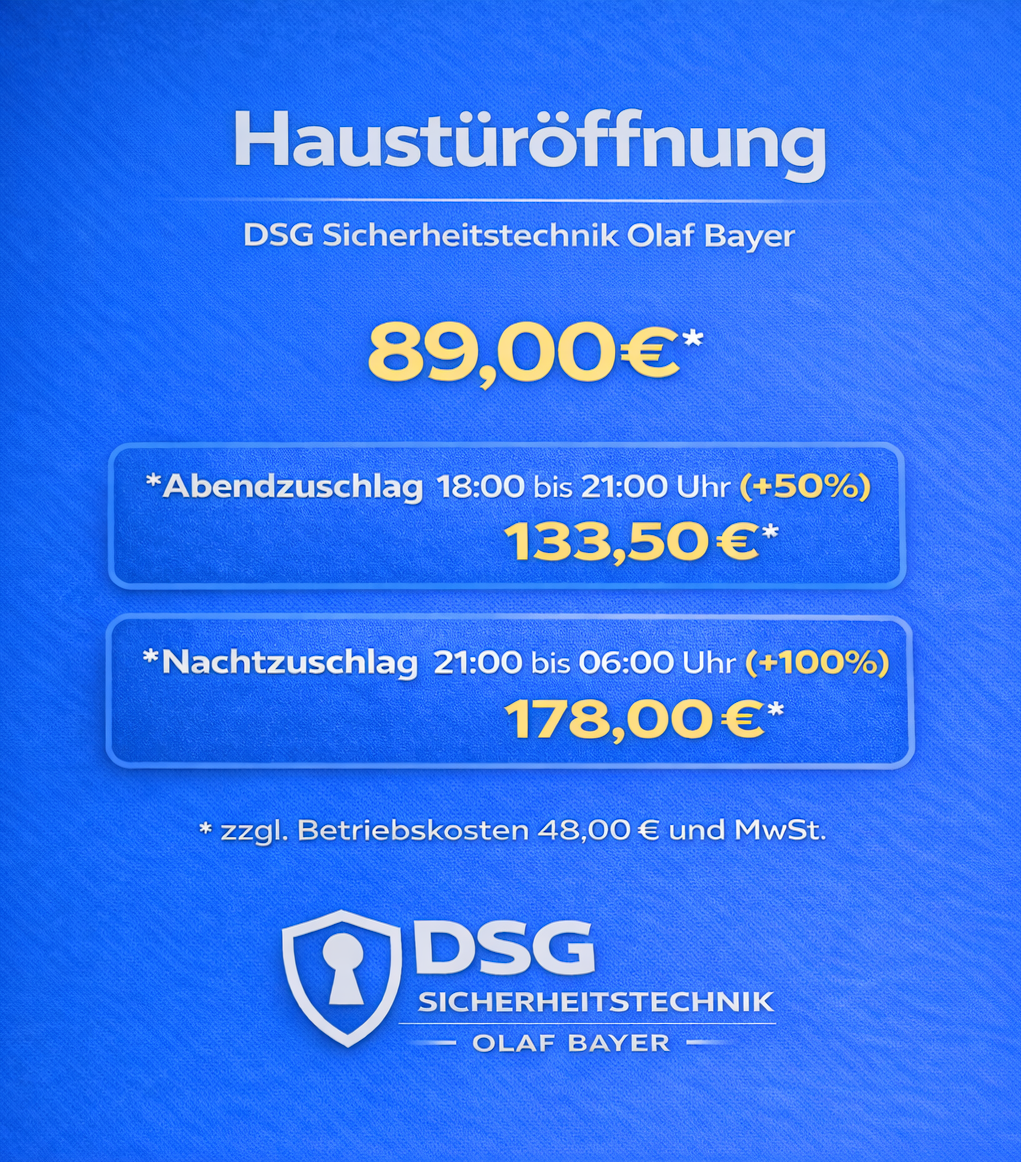 Der Preis bemisst sich nach dem Zeitpunkt der Durchführung der Türöffnung und nicht nach dem Zeitpunkt der Auftragserteilung. Zuschläge für Wochentage nach unserer Liste 18:00 bis 22:00 Uhr 50% ab 22:00 bis 06:00 Uhr 100%. Samstag – Sonntag und Feiertags immer 100% auf alle Dienstleistungen. Türöffnungen,- Garagenöffnungen oder Tresoröffnungen können je nach Öffnung mit Mehrkosten berechnet werden (unsere AGB kommen hier immer zum tragen). Nachberechnungen zur erstellten Rechnung vor Ort und Zahlung sind nicht möglich. Fragen Sie bitte Ihren Monteur zu Ihrer Rechnung vor Ort.